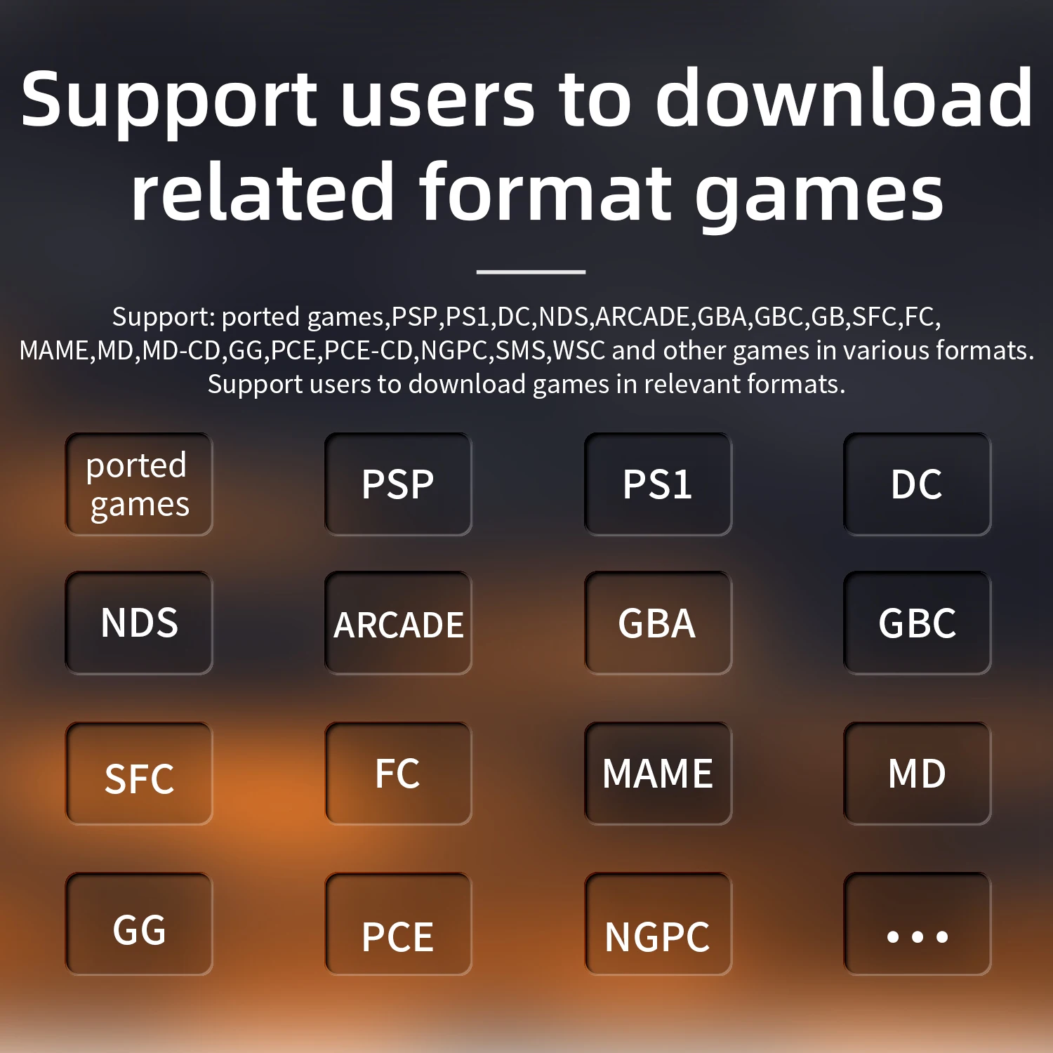 Games:Support: ported games,PSP,PS1,DC,NDS,ARCADE,GBA,GBC,GB,SFC,FC,MAME,MD,MD-CD,GG,