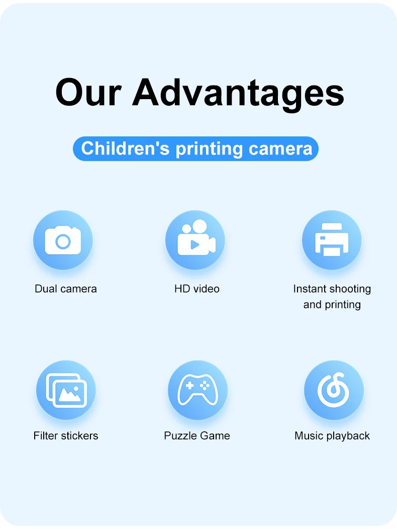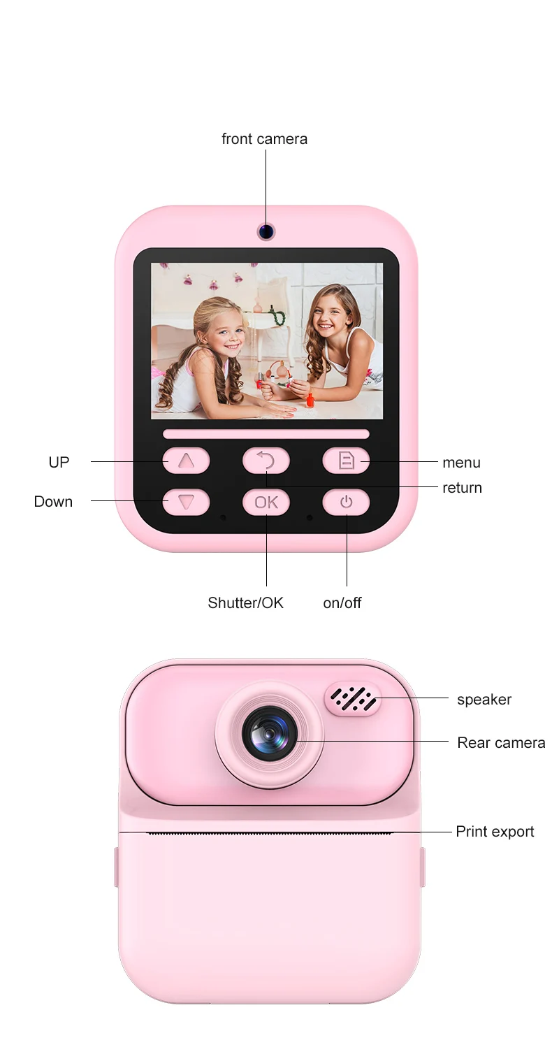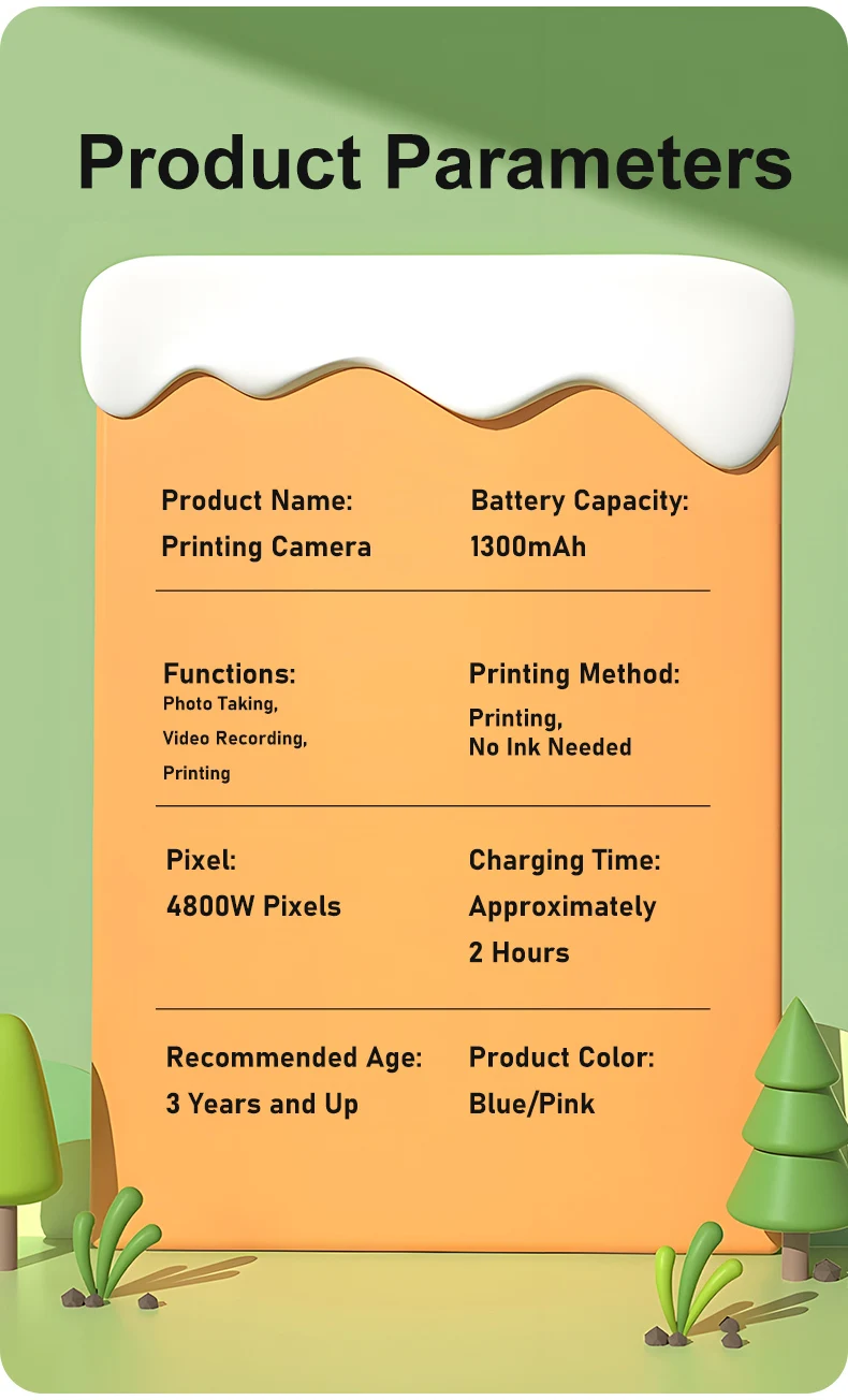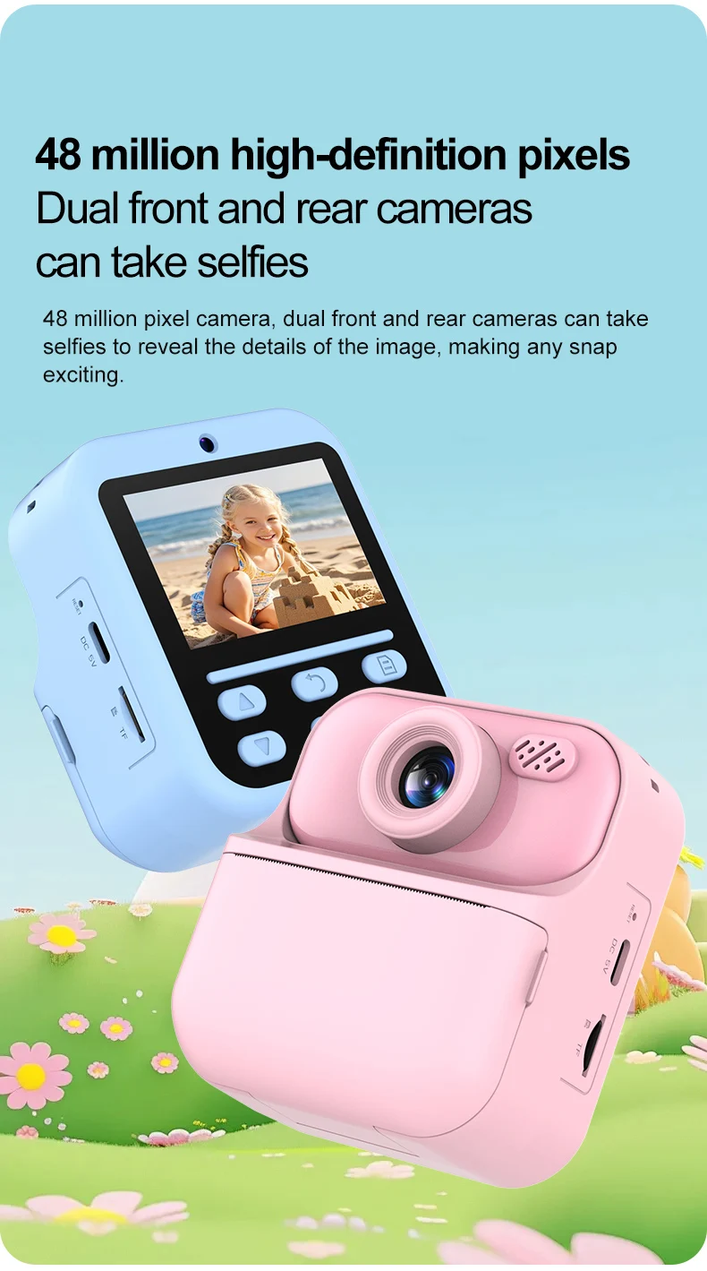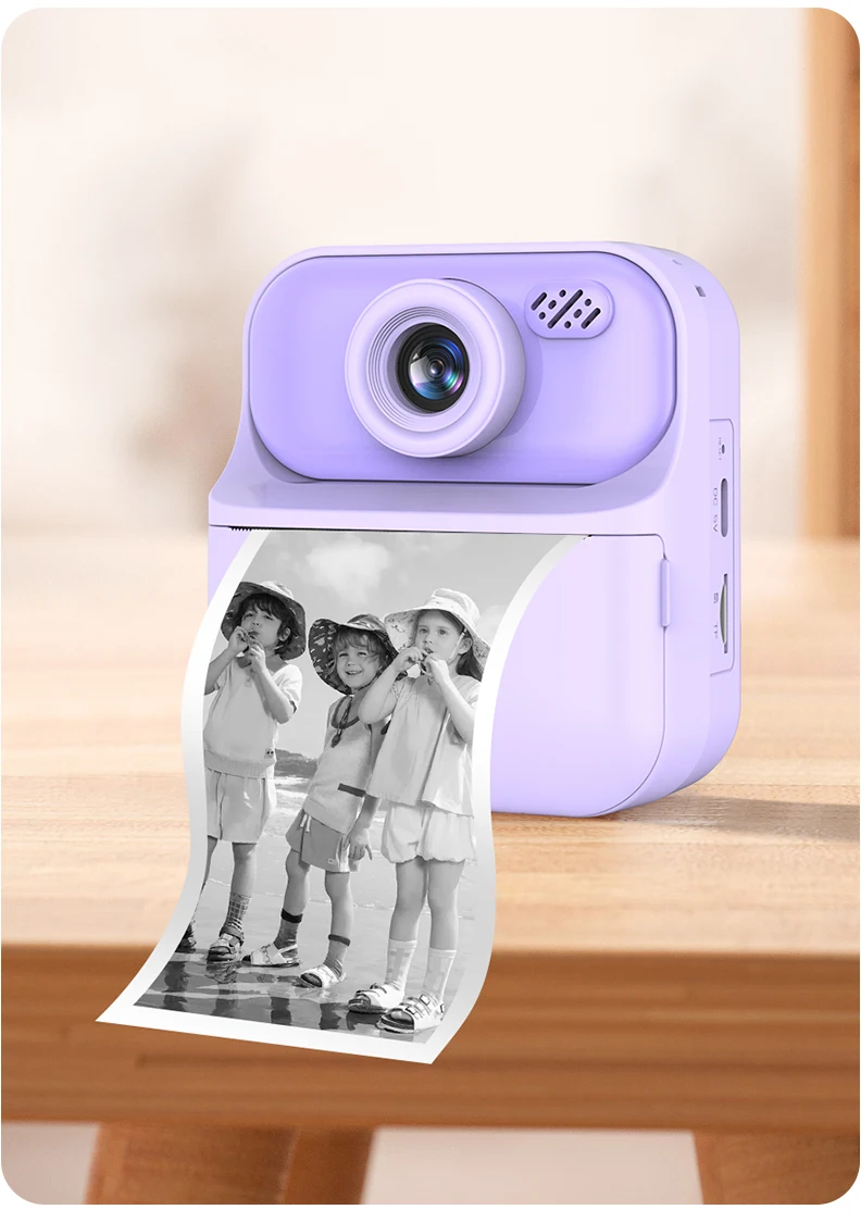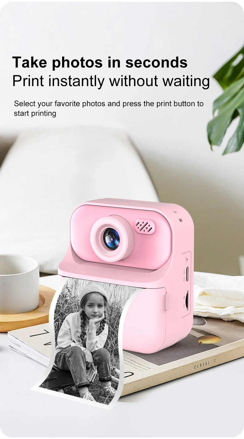 Features: 1.Instant Photo Printing Camera: This multifunctional camera is for kids. It doubles as a video digital camera, allowing children to capture their favorite moments with just a click. Press the print button, and the camera instantly produces either a black-and-white photo. 2.Dual Cameras: Featuring 4800 megapixels and a dual-camera system, this hd digital camera offers a 2.4-inch large screen that is easier on the eyes, making selfies and captures more enjoyable and safe for kids. 3.Long Battery Life: With a built-in 1300mAh lithium battery, this portable digital camera charges conveniently via the included USB cable, offering long operating times, so kids can enjoy capturing memories without interruption. 4.Safe Print Paper: The materials used in this instant print camera are safe for children, made from high-quality soft plastic and advanced thermal printing technology, ensuring no toner, no odor, and non-toxic properties. 5. Gift for Kids: An ideal gift for children aged 3-12, this instant photo printing camera is for various occasions like Christmas, birthdays, and more. Kids can document every happy moment at family gatherings, school camps, outdoor activities, and travel. Specification: Origin: Mainland China Display: 24. inch TFT LCD IPS Battery capacity: 1300mAh Function: photo, video, print Printing method: thermal printing, no ink required Pixels: 4800w Charging time: about 2 hours Video pixels: 1920*1080/1280*720/640*480 Photo resolution: 40M. 20M. 18M. 16M. 12M. 8M. 5M. 3M. 2M Packaging size: 146*130*59mm/5.69*5.07*2.3in Gross weight: 360g Note: ![]() 1x Printing Camera